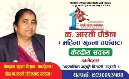 • पुर्व कृषिमन्त्री पौडेलको केन्द्रीय सदस्यमा उमेद्बारी बुटवल, लुम्बिनी प्रदेशका पुर्व कृषि मन्त्री आरती पौडेलले नेकपा एमालको महाधिवेसनमा केन्द्रीय सदस्य पदमा उमेद्बारी दिएकी छन् । लुम्बिनी प्रदेश सरकार स्थापनाको ताका पहिलो महिला कृषि मन्त्रीको रुपमा सफल कार्याकाल पुरा गरेकी मन्त्री पौडेल अखिल नेपाल किसान महासंघको लुम्बिनी प्रदेश ईन्चार्ज तथा केन्द्रिय सचिव समेत हुन। ...